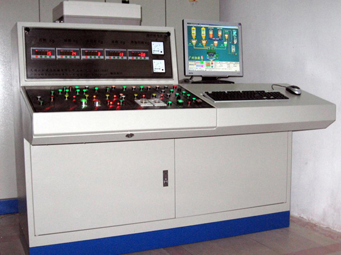 雙機90攪拌站電氣控制系統主要由控制臺以及交流接觸器等為核心的強電控制組成,全套系統均安裝在控制室內,可完成配料、提升、攪拌、卸料生產全過程的自動、半自動控制。